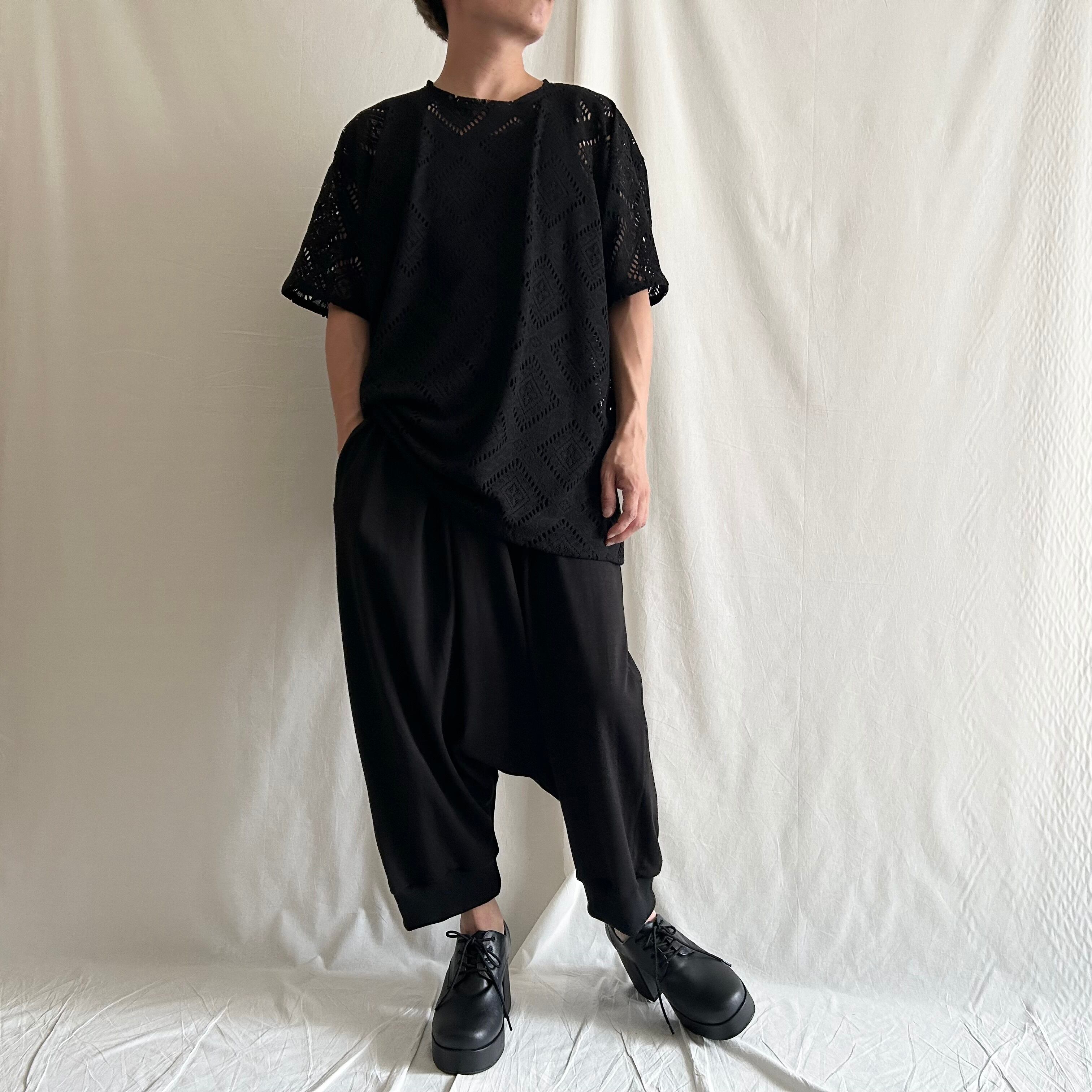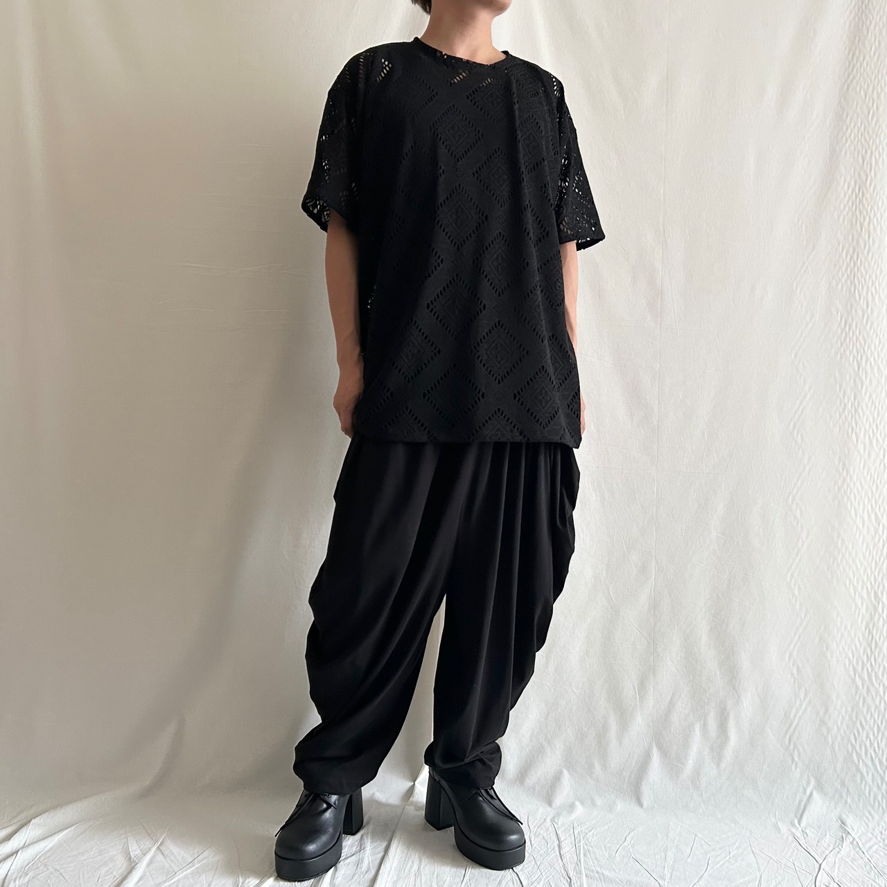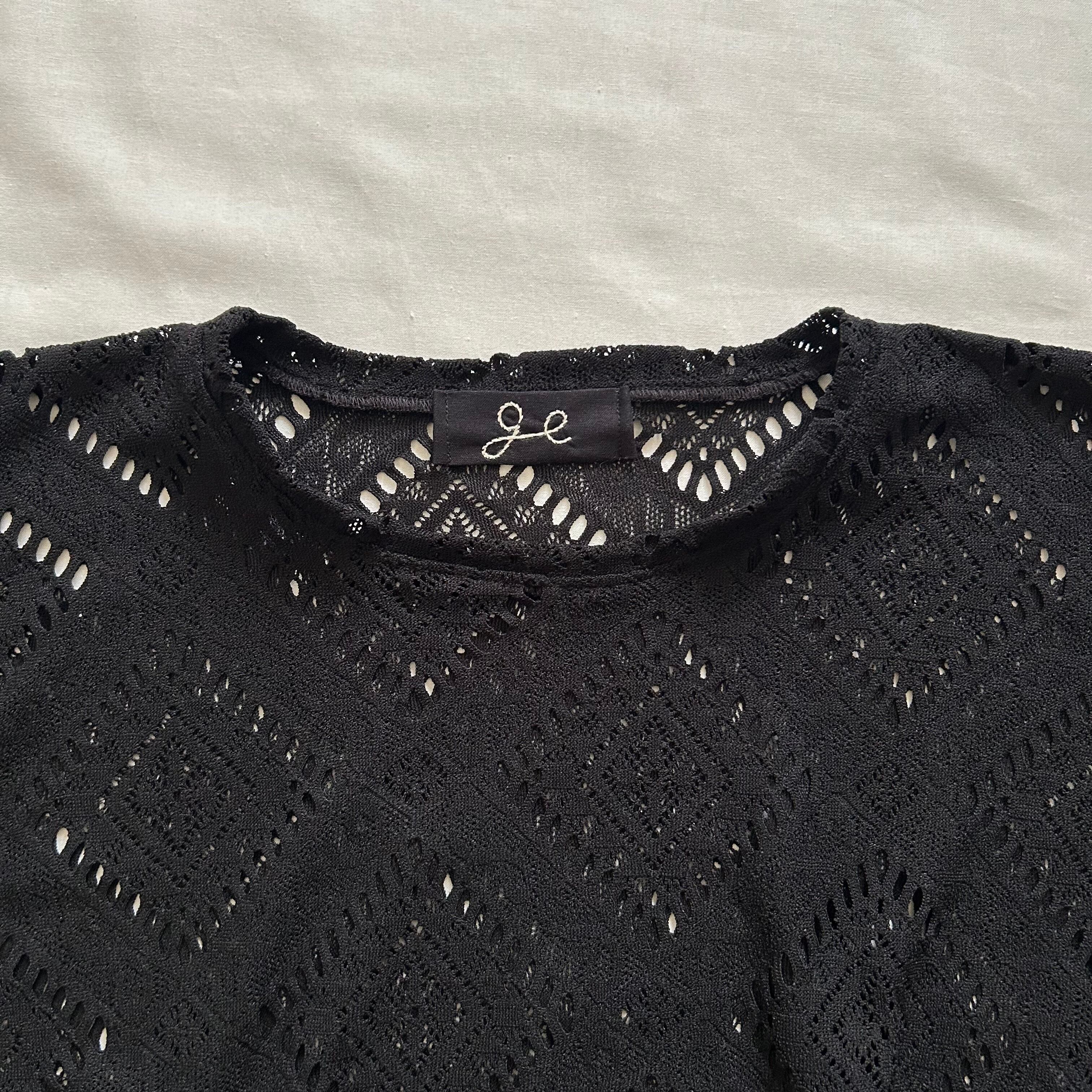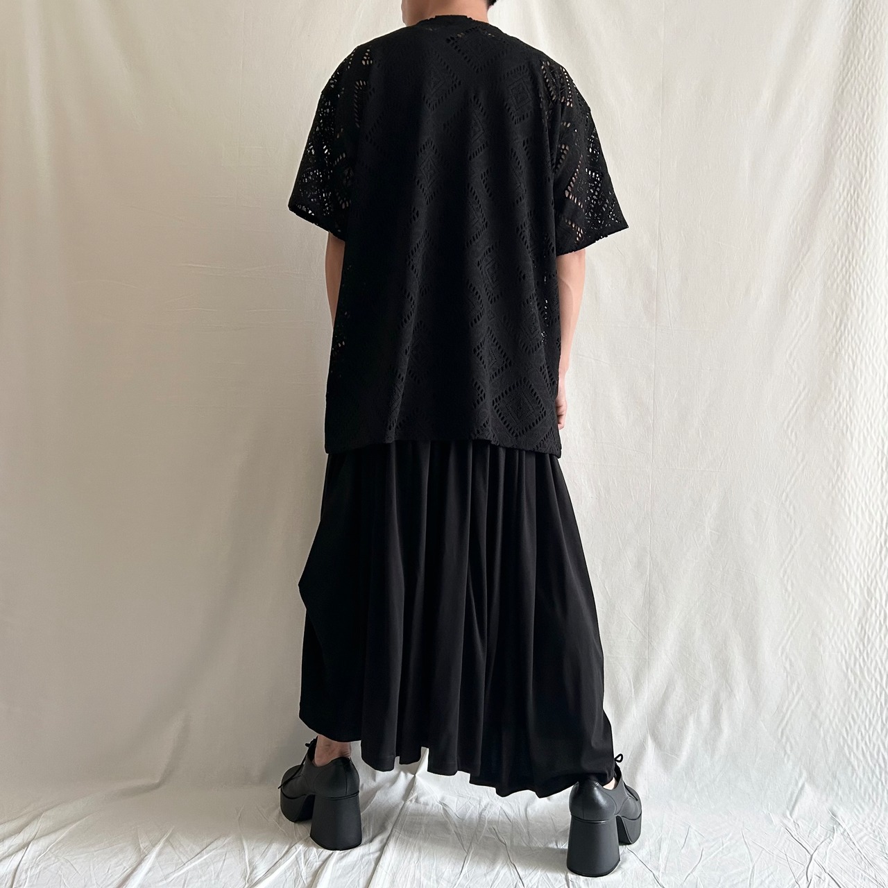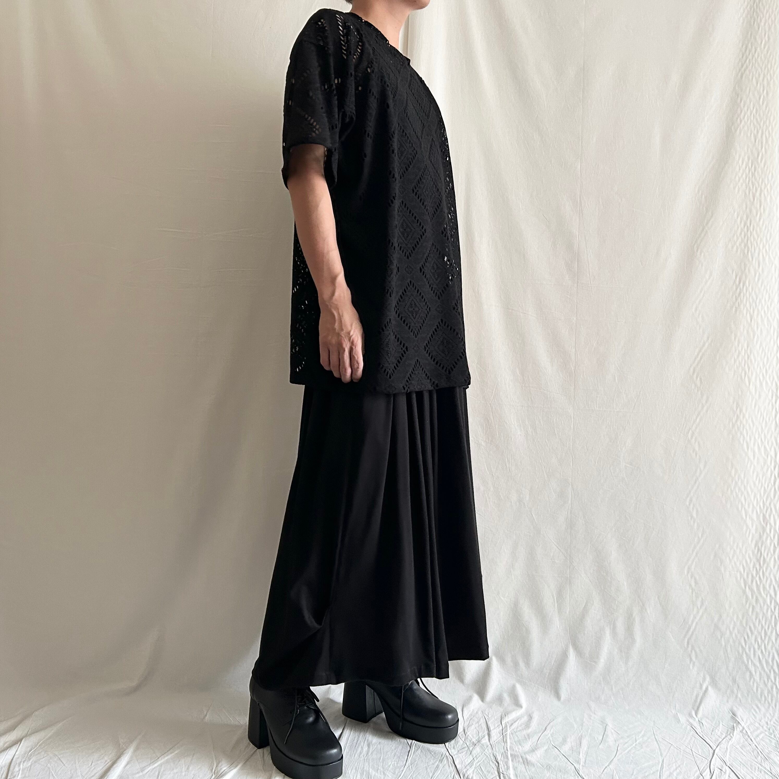全体にゆるい雰囲気ですが、シックな幾何学レースが目を惹く存在感のある一枚。