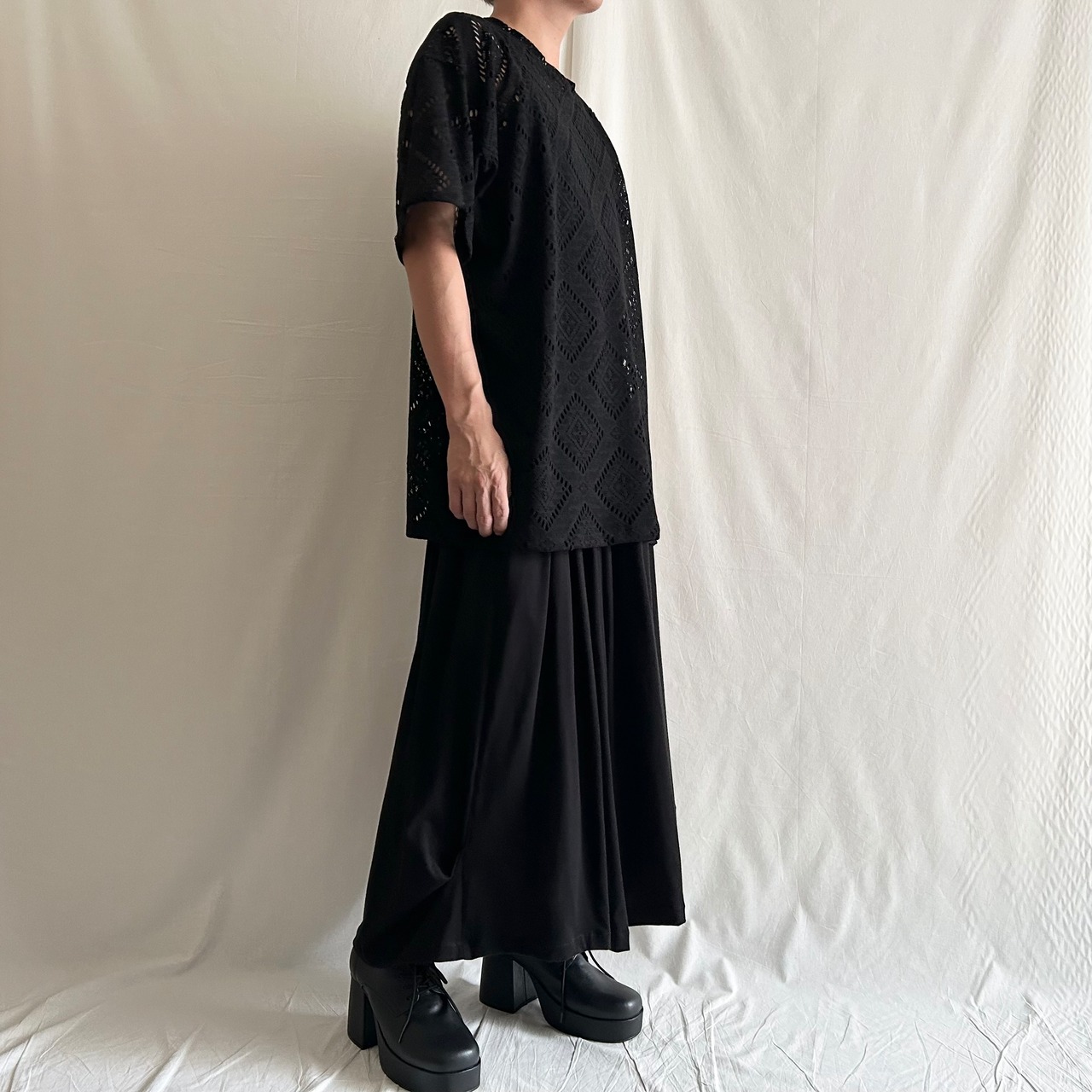 透け感を活かしたモードスタイルに。