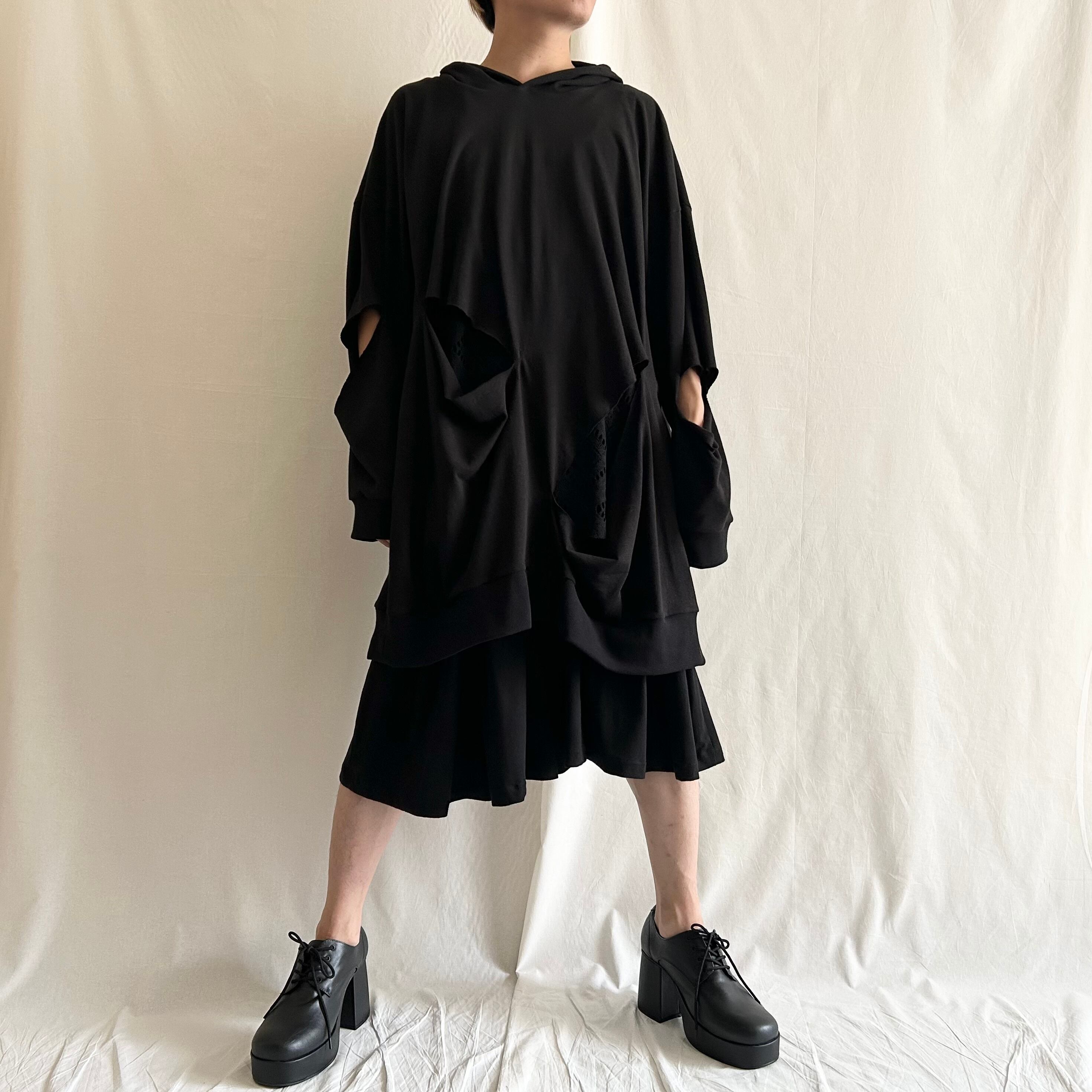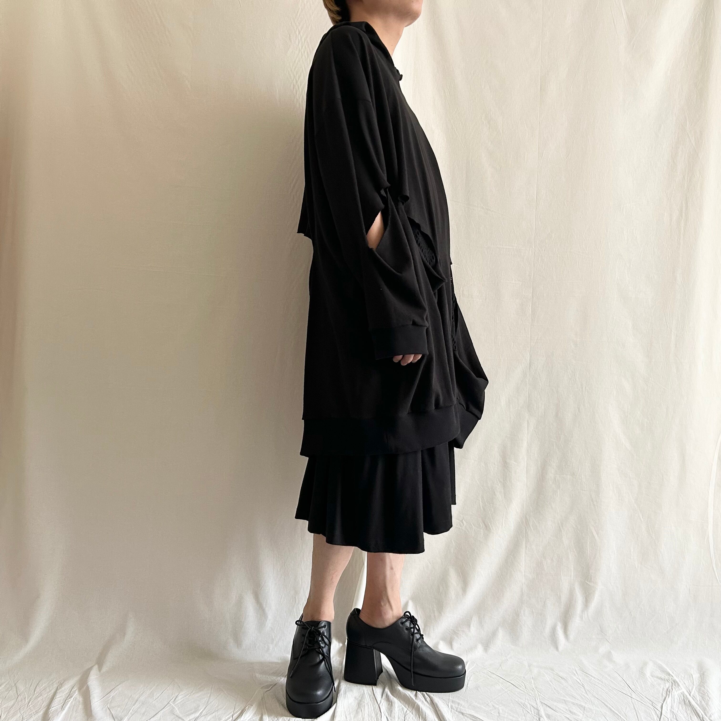 nalgeでは、「Drape」をキーワードに黒を基調としたゆるい服を製作しています。