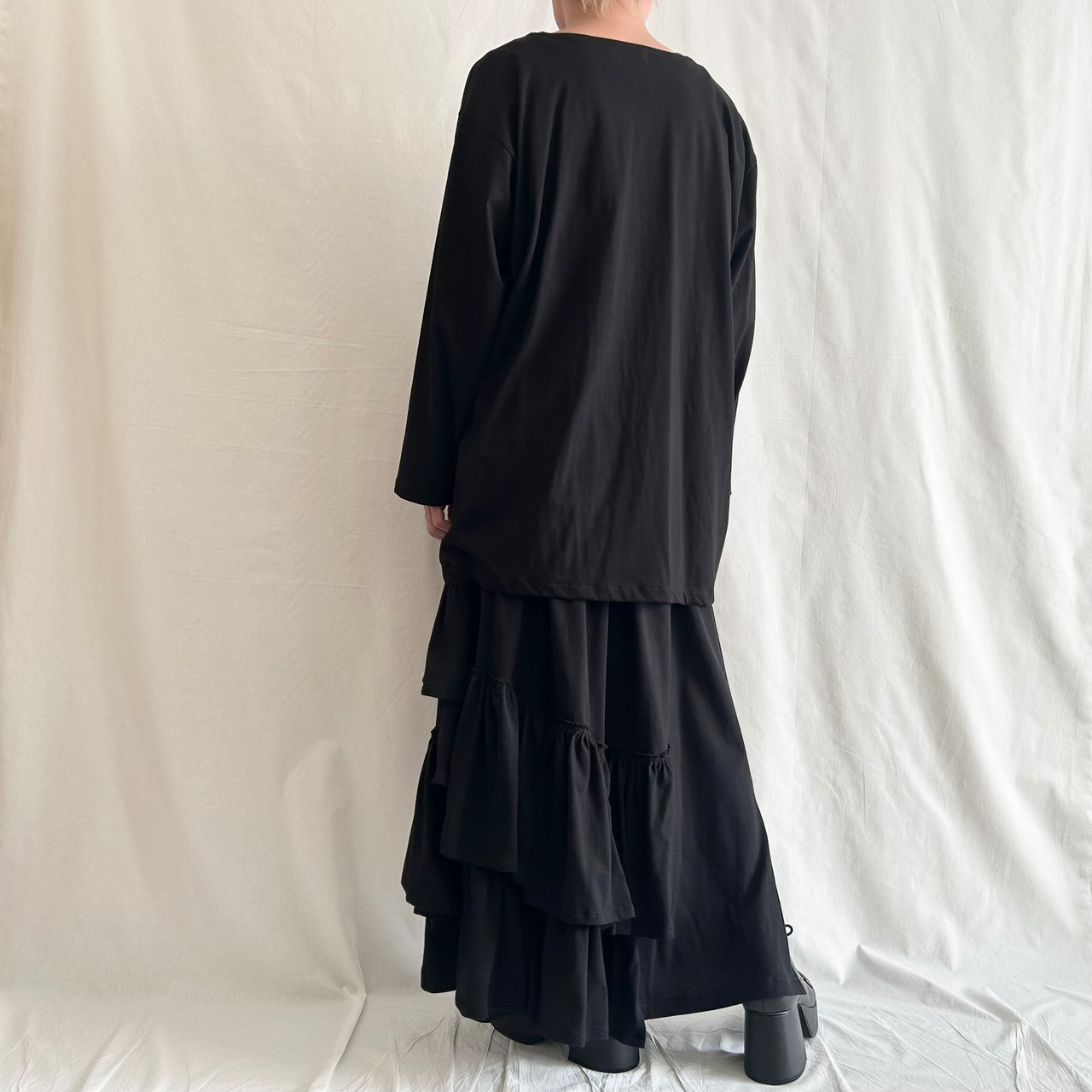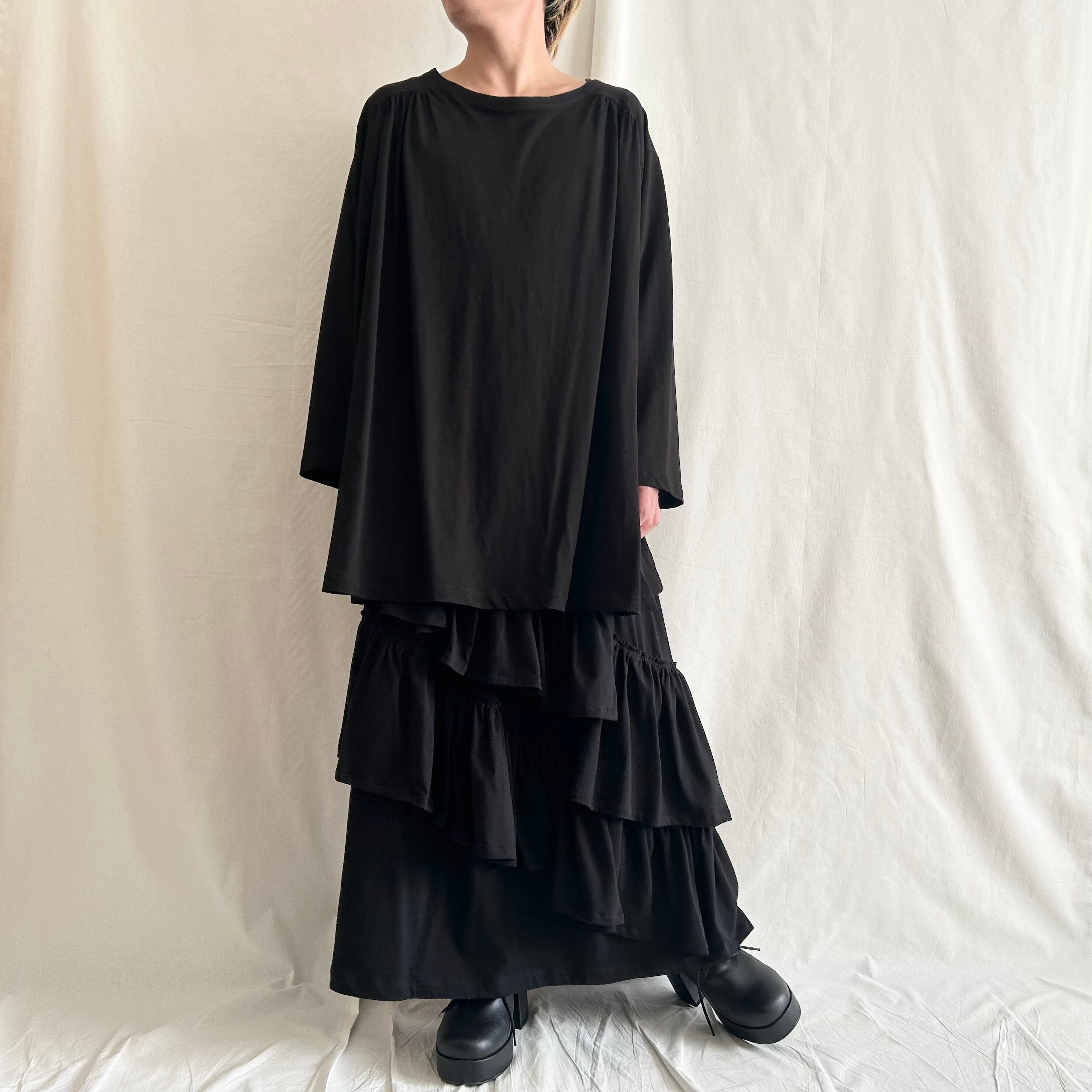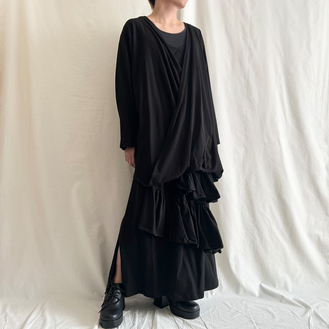 nalgeでは、「Drape」をキーワードに黒を基調としたゆるい服を製作しています。