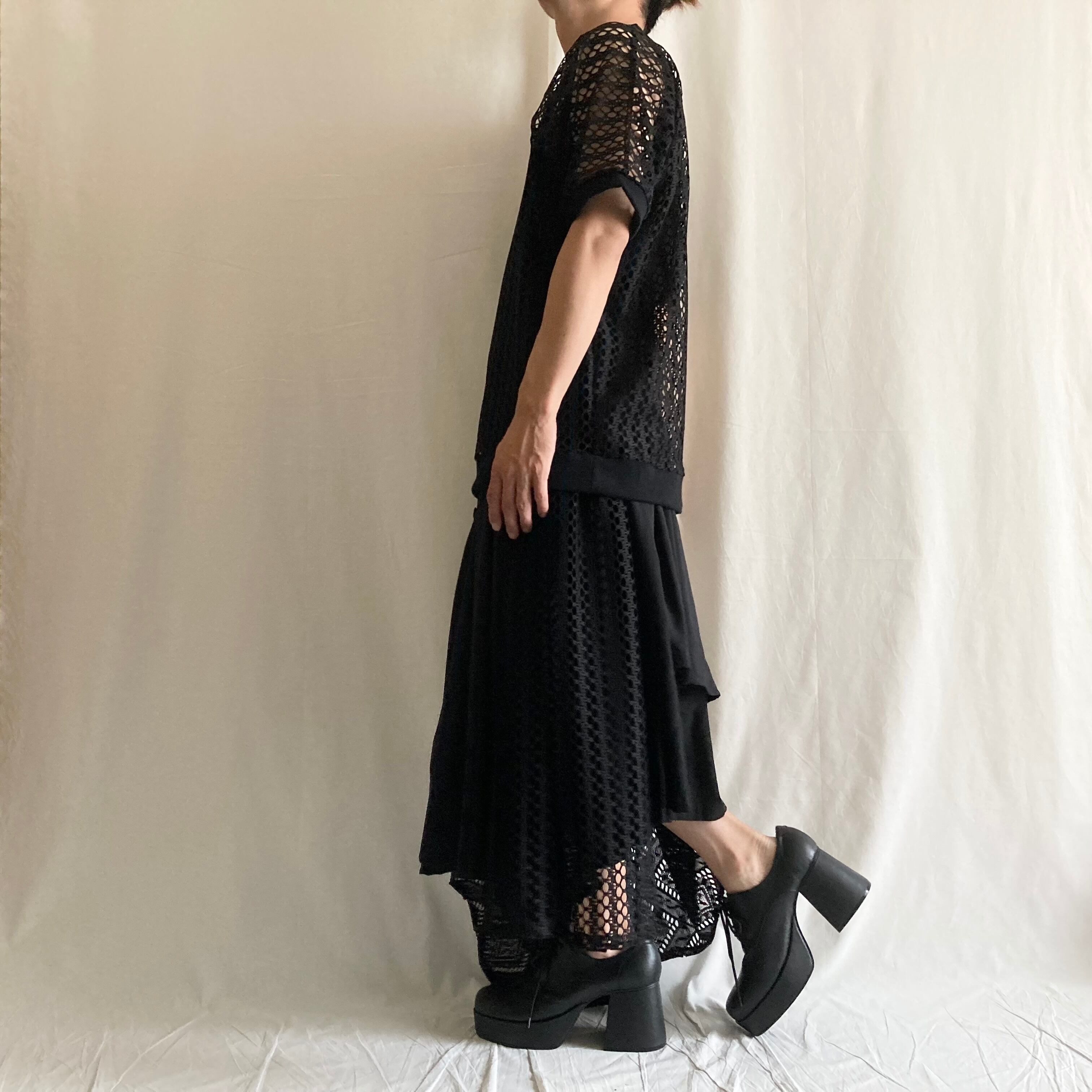 シンプルなボトムと合わせてレースを際立たせたスタイルに。
